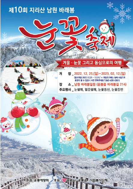 소개 따스한 봄날은 연분홍 철쭉으로, 북풍한설 겨울날은 순백의 모습으로 철따라 아름다운 자태를 뽐내는 지리산 자락 바래봉에서 지리산 남원 바래봉 눈꽃축제가 펼쳐집니다 내용 지리산 남